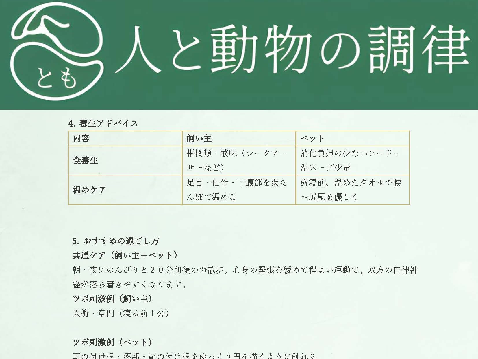 ★ モデルケース①:飼い主1名+ワンちゃん1匹 ※施術内容・体質分析・養生アドバイスレポートご希望の場合