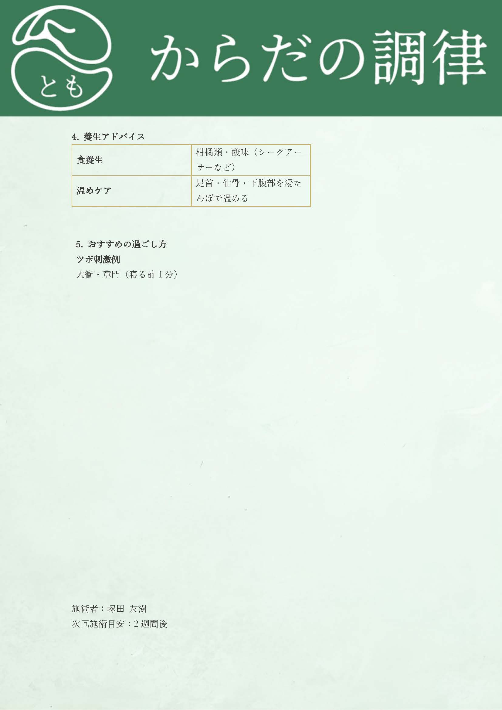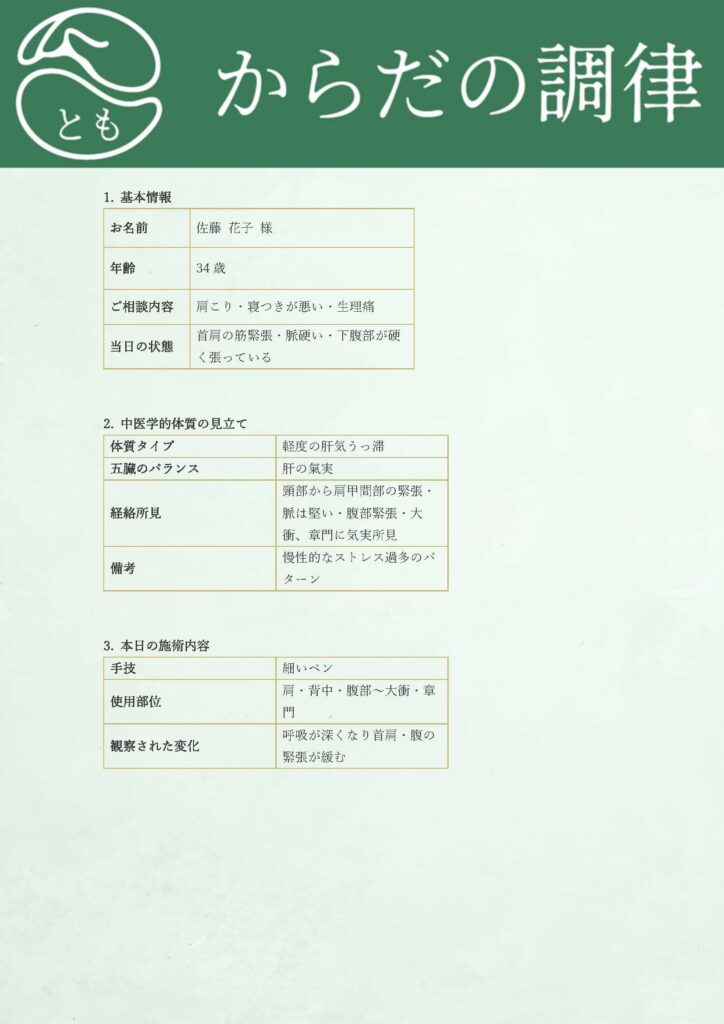 施術内容・体質分析・養生アドバイスレポート